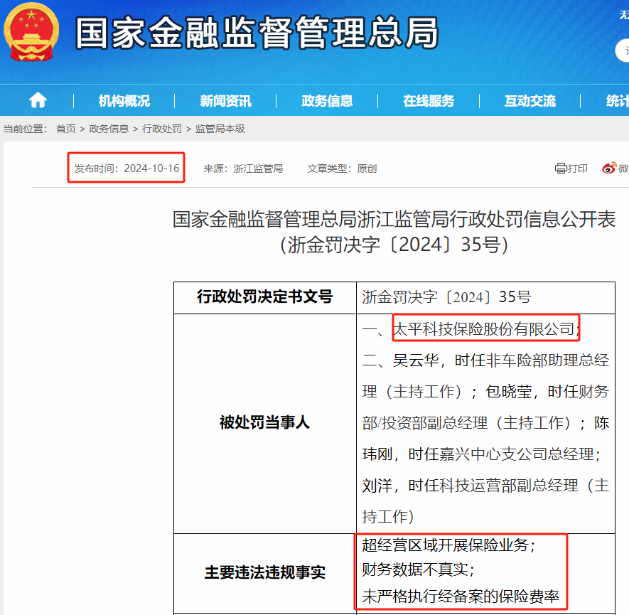 二、2024年10月16日,太平科技保险股份有限公司浙江分公司因“超经营区域开展保险业务”处罚款人民币3万元。