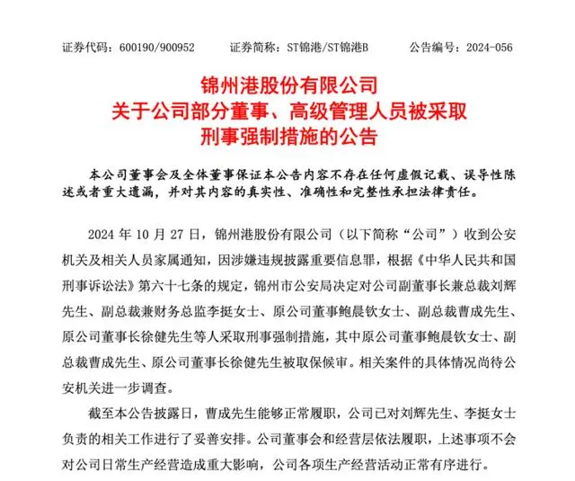ST锦港(600190.SH)今日晚间公告,因涉嫌违规披露重要信息罪,公司副董事长兼总裁刘辉等人被锦州市公安局采取刑事强制措施。