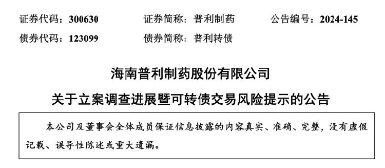 12月9日晚间,普利制药(300630.SZ)发布关于立案调查进展暨股票交易风险提示的公告称,目前,公司正在被中国证监会立案调查,前期会计差错更正及追溯调整等相关情况以最终调查结果为准。若后续经中国证监会行政处罚认定的事实,公司触及《深圳证券交易所创业板股票上市规则》规定的重大违法强制退市情形,公司股票存在被实施重大违法强制退市的风险。