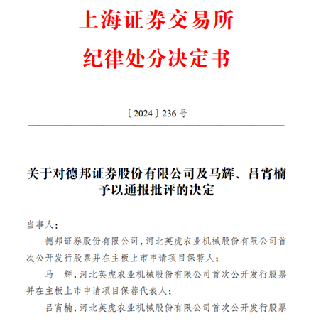 近日,因在河北英虎农业机械股份有限公司(下称“发行人”)发行上市申请过程中存在违规行为,德邦证券作为项目保荐人,马辉、吕宵楠作为保荐代表人被上交所通报批评。