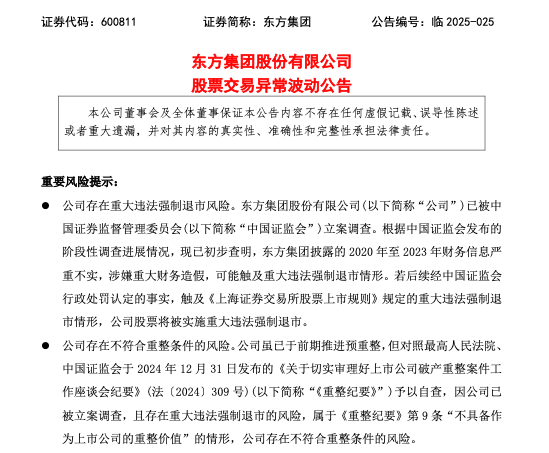 3月4日晚间,东方集团股份有限公司发布股票交易异常波动公告。公告显示,公司股票在2025年2月28日、3月3日、3月4日连续三个交易日内收盘价格跌幅偏离值累计超过20%,根据《上海证券交易所交易规则》,属于股票交易异常波动情形。公司已被中国证监会立案调查,初步查明其2020年至2023年财务信息严重不实,涉嫌重大财务造假,可能触及重大违法强制退市。若后续经证监会行政处罚认定相关事实,公司股票将被实施退市。