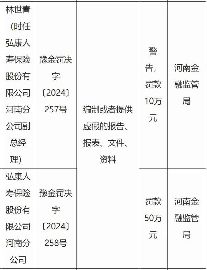 此外,2025年元旦前夕,因编制或者提供虚假的报告、报表、文件、资料,河南金融监管局对弘康人寿河南分公司及其副总经理开除共计60万罚款 。
