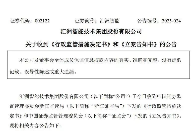 在经历立案调查、债务重组等一系列危机后,曾经的*ST天马成功摘帽并改名为汇洲智能(002122.SZ)。但好景不长,走出泥潭的汇洲智能于2024年再度亏损,近日更是曝出涉嫌信披违被证监会立案。