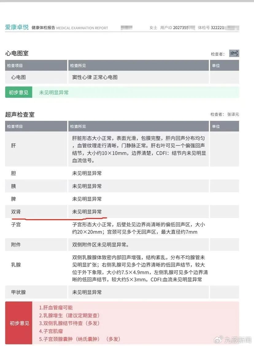据张晓玲介绍,作为北京律协会员,她长年享有北京律协为每位律师购买的体检服务。从2013年至2023年,她连续10年在爱康国宾体检设于北京的分院进行体检。2022年之前的体检,她的双肾的体检结果一直都是“未见明显异常”。2024年,她换了一家体检机构,结果在腹部彩色超声检查时被发现:“右肾囊肿,右肾可见一低回声,大小:3.5cm×2.8cm,呈分叶状,血流信号丰富”,并被建议到医院进一步检查。