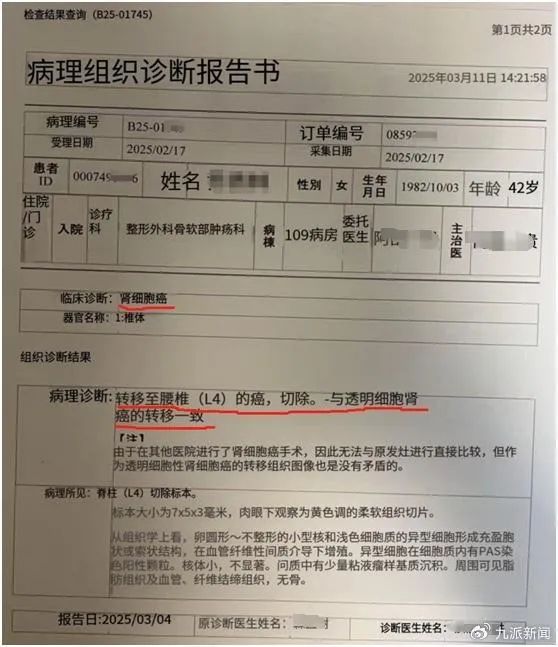 2024年10月,张晓玲在北京大学国际医院被怀疑“右肾透明细胞癌”,进行右肾摘除手术后,病理显示为“透明细胞型肾细胞癌”。由于手术后仍感觉身体不适,张晓玲在2025年2月又到国外的医院进行了检查,结果被确诊为“肾癌骨转移”,而且骨转移已经达到了晚期程度。