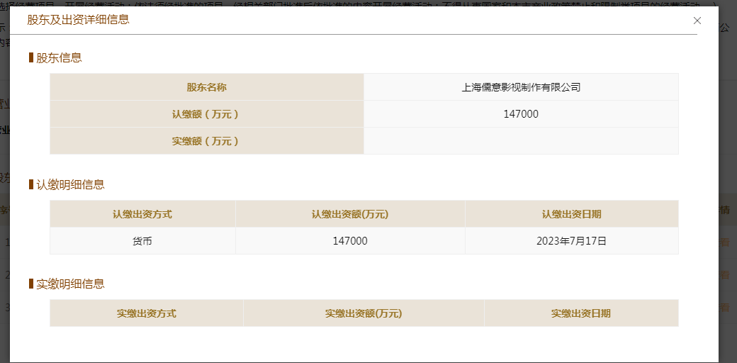 另据国家企业信用信息公示系统显示,儒意影视股东认缴出资日期为7月17日,认缴出资额为14.7亿元。