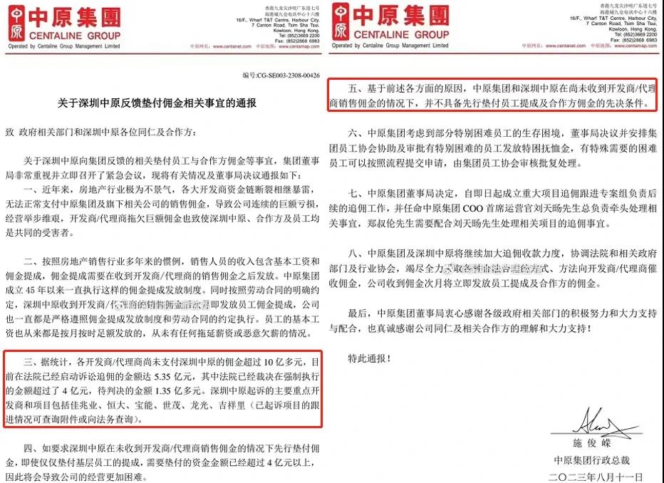 8月19日,界面新闻大湾区频道记者在网上看到一份名为《关于深圳中原反馈垫付佣金相关事宜的通报》的文件,落款是“中原集团行政总裁施俊嵘”,日期为2023年8月11日。