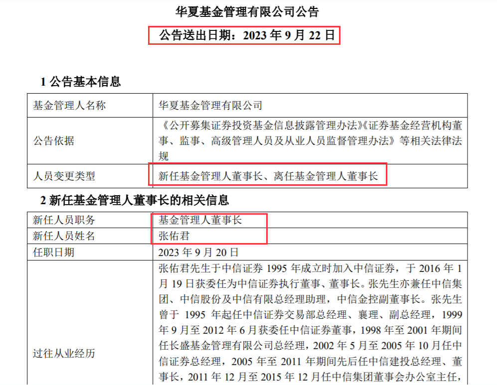 9月22日,华夏基金发布高管变更公告,因工作需要公司董事长杨明辉离任,张佑君出任公司新董事长。和杨明辉类似,张佑君同样有着中信证券任职经历,早在1995年中信证券成立时,就加入了中信证券。而在杨明辉任上,华夏基金的公募基金管理规模达到了1.25万亿元,位居国内公募基金行业第三名。