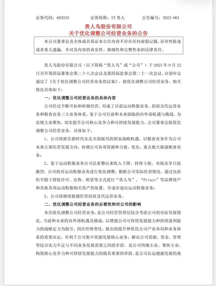 9月22日晚间,贵人鸟股份有限公司发布关于优化调整公司经营业务的公告,宣布将结束经营36年之久的运动鞋服业务。