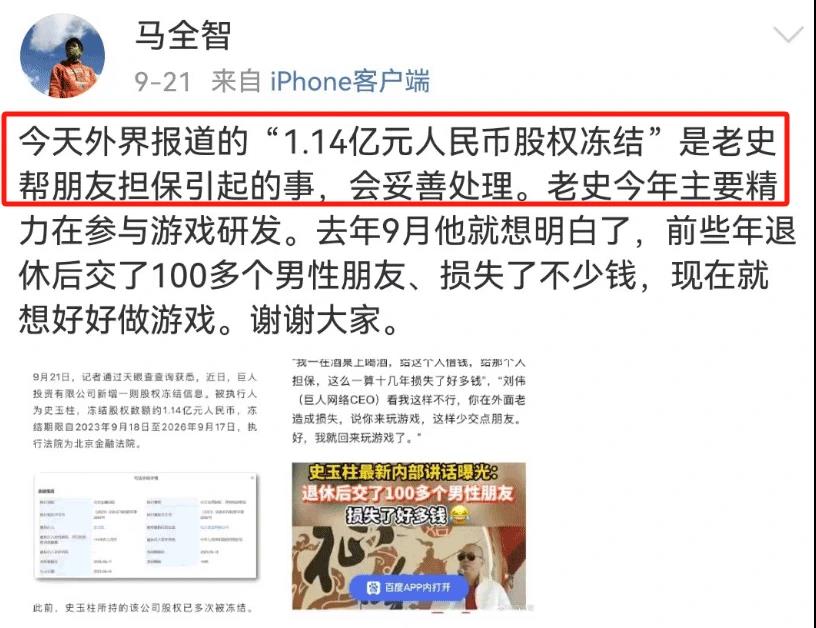 9月21日,巨人集团马全智发微博回应,“1.14亿元人民币股权冻结”是史玉柱帮朋友担保引起的事,会妥善处理。
