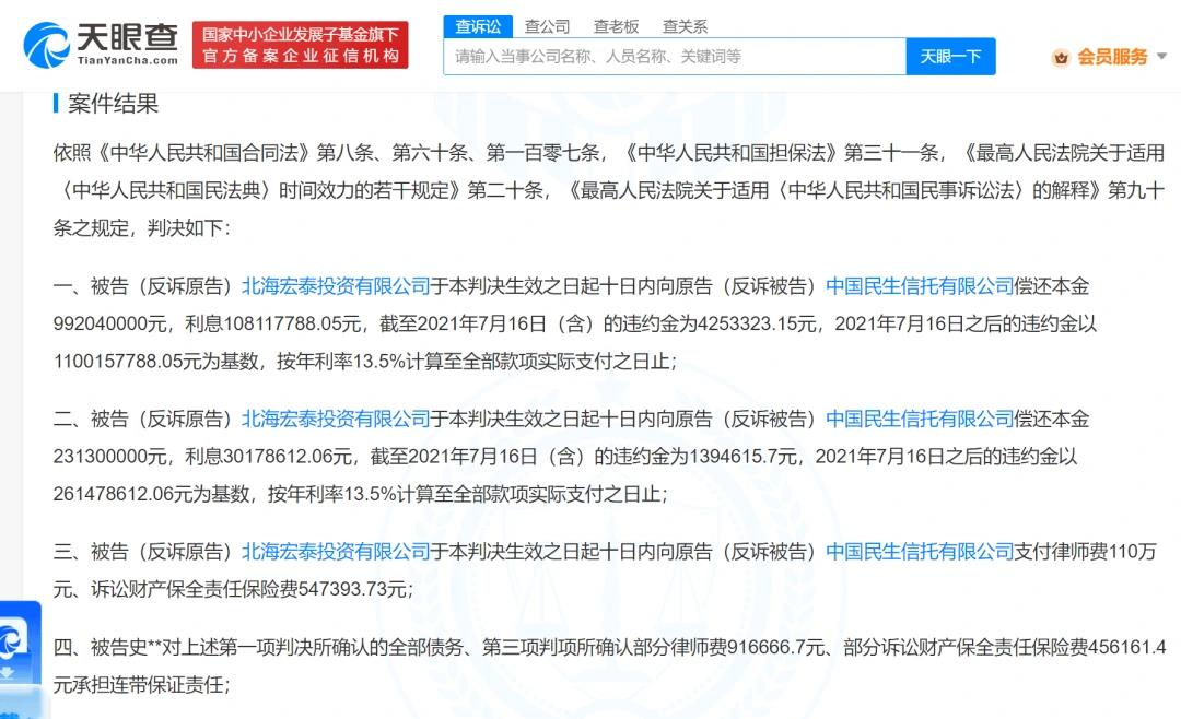 第二项判决为,宏泰投资在判决生效之日起十日内,向中国民生信托有限公司偿还本金约2.31亿元,利息3017.86万元。