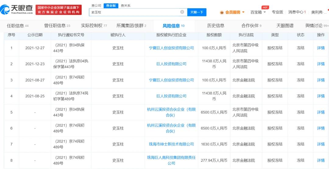 其中,2021年12月,史玉柱旗下约1.98亿元企业股权遭冻结,包括巨人投资、杭州云溪投资合伙企业(有限合伙)、珠海巨人高科技集团有限责任公司、珠海市绅士新技术有限公司4家公司股权,执行法院均为被北京市第四中级人民法院。