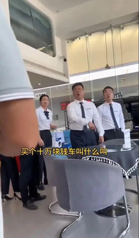 网传视频显示,该4S店几个工作人员冲着拍摄者说道,“买个10万元的车叫什么叫”,“不买就滚”,“刚才谁在这里拍桌子我没说话,在这里叫什么叫”,“我们现在不卖,请你们出去可以吗”,“打110报警,他们现在拍我们”,“价格给你了,又降不下来,叫什么叫”。