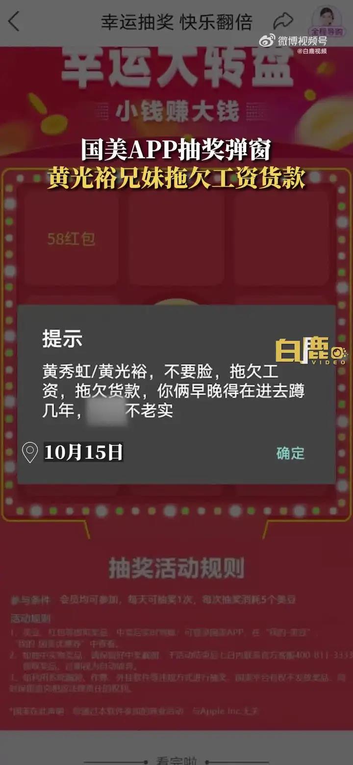 10月15日。国美APP幸运抽奖页面,显示“黄秀虹、黄光裕不要脸,拖欠工资,拖欠货款”等辱骂词汇。据了解,黄秀虹是国美电器董事长,黄光裕则是国美创始人。截止发稿,多次联系国美客服均未有人回应。