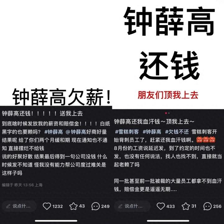 近日,有疑似钟薛高的多位内部员工在社交平台爆料,要求欠薪的钟薛高“还钱”。