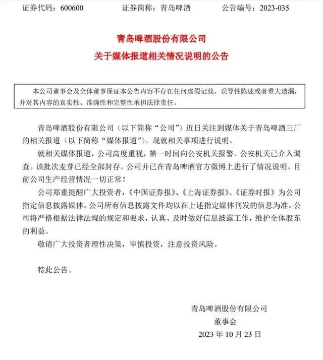 10月23日上午,青岛啤酒再度发布公告称,目前公司生产经营情况一切正常,并以惊叹号结尾。