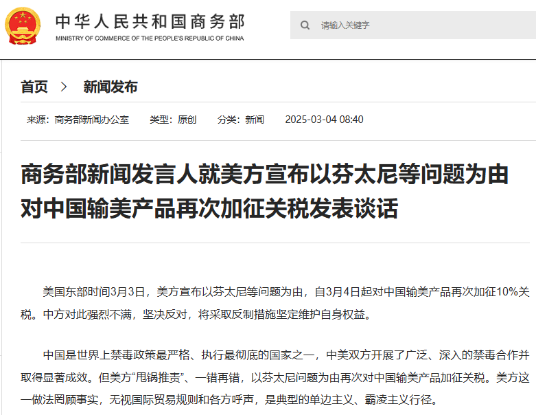 美国东部时间3月3日,美方宣布以芬太尼等问题为由,自3月4日起对中国输美产品再次加征10%关税。中方对此强烈不满,坚决反对,将采取反制措施坚定维护自身权益。