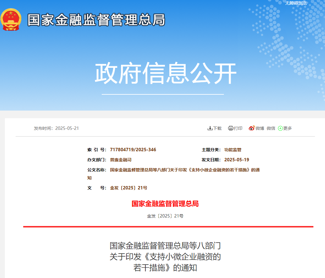 为深入贯彻落实党的二十届三中全会和中央金融工作会议、中央经济工作会议精神,做好普惠金融大文章,进一步改善小微企业、个体工商户融资状况,金融监管总局、中国人民银行、中国证监会、国家发展改革委、工业和信息化部、财政部、税务总局、市场监管总局于近日联合印发了《支持小微企业融资的若干措施》(以下简称《若干措施》)。