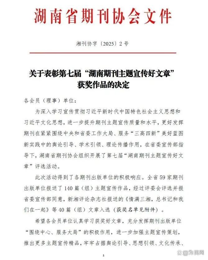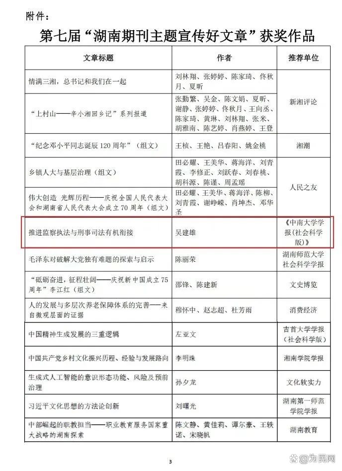 近日,由湖南省期刊协会组织开展的第七届“湖南期刊主题宣传好文章”评选活动结果揭晓。此次评选活动旨在深入学习贯彻习近平新时代中国特色社会主义思想和习近平文化思想,提升期刊主题宣传质量和水平,服务“三高四新”美好蓝图新实践。全省59家期刊出版单位报送了140篇(组)主题宣传作品,经过评委会严格评选,最终40篇(组)文章入选。吴建雄教授刊登在《中南大学学报(社会科学版)》2024年第5期的《推进监察执法与刑事司法有机衔接》一文凭借其学术价值、社会影响和传播效果脱颖而出,获此奖项。