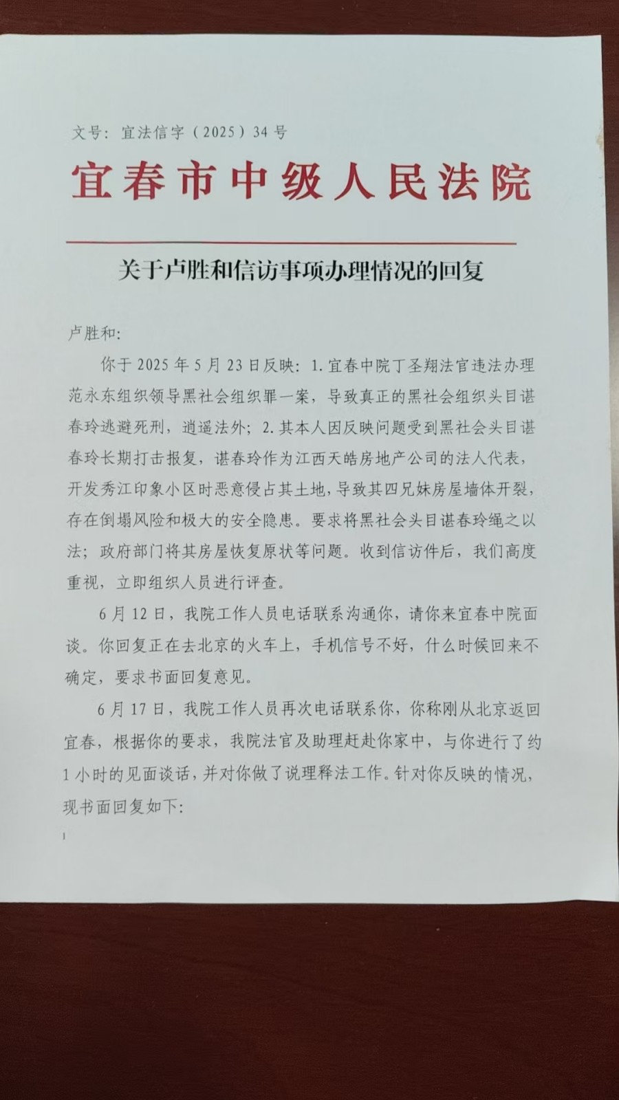 本人卢胜和,现针对贵院于2025年6月18日作出的宜法信字(2025)34号信访回复函提出如下异议: