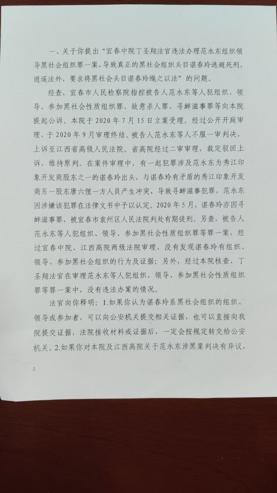 二、回复事项均未提供证据证明其真实性,无任何说服力。关于丁圣翔法官范永东组织领导黑社会性质组织罪一事,贵院仅简述该案的办案流程,回复中提到相关法律文书、证据材料均未作为附件向本人提供,无法核查该回复的真实性。且该回复是由丁圣翔所写,因此回复中提到“经本院核查,丁圣翔法官在审理范永东等人犯组织、领导、参加黑社会性质组织罪等罪一案中,没有违法办案情况”就是自说自话,循环论证。本人反映的就是丁法官违法办案,结果其本人写了一个回复称自己没有违法办案,且未提供任何证据证明,这实在让人难以信服。该事项实际为申请查处违法行为,故该事项应当由贵院纪检监察部门负责调查处理,而非由该法官自行作出处理。因此,贵院的回复无任何说服力,本人无法接受。