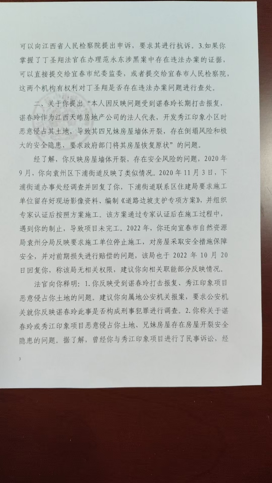 三、贵院办理该信访事件存在消极推诿等违法行为。本人向贵院反映丁圣翔法官违法办案导致谌春玲一直逍遥法外,以及本人受到谌春玲打击报复,由谌春玲担任法定代表人的江西天皓房地产公司开发秀江印象小区时侵占土地,导致本人房屋有倒塌风险两件事情。贵院均是回复让本人自行收集相应证据,然后向有关机构提交处理,对相关事实未进行任何的调查。《信访工作条例》第二十八条规定:各级机关、单位及其工作人员办理信访事项,应当恪尽职守、秉公办事,查明事实、分清责任,加强教育疏导,及时妥善处理,不得推诿、敷衍、拖延。根据该规定,贵院对本人反映的情况有查清事实的责任和义务,现贵院将该义务推向本人明显违反该规定,属违法行为。