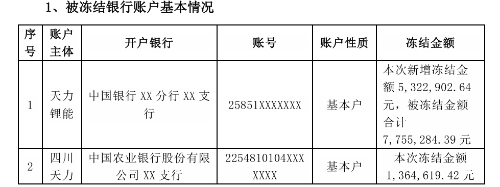 公告显示,天力锂能基本户本次新增冻结金额为532.29万元,四川天力基本户被冻结金额为136.46万元。