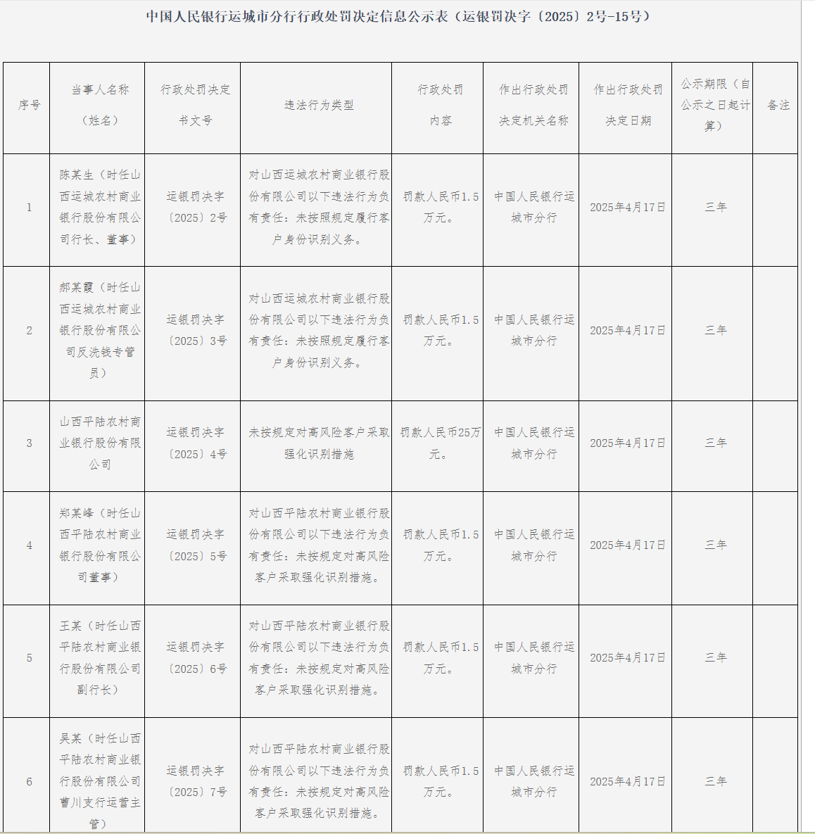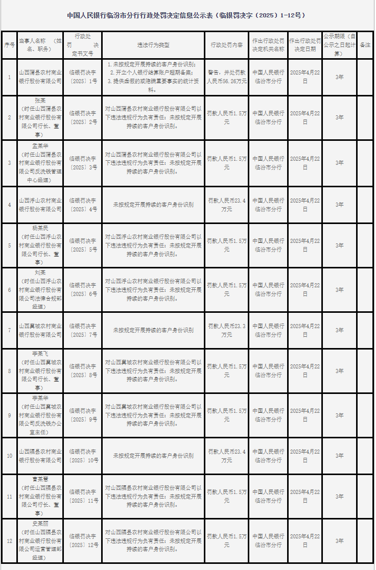 此次处罚中涉及8家农商行,累计收到27张罚单。从违法行为类型来看,客户身份识别违规问题最为突出,多家银行因未落实客户身份识别制度被重罚。山西蒲县、浮山、翼城、隰县农村商业银行股份有限公司均未按规定开展持续的客户身份识别,其中蒲县农商行因此被罚款56.26万元,浮山、翼城、隰县农商行分别被罚款23.4万元、23.3万元、23.4万元,相关责任人各被罚款1.5万元。山西运城农村商业银行股份有限公司(简称:山西运城农商行)未按照规定履行客户身份识别义务,被罚款115.868万元,时任行长、董事陈某生和反洗钱专管员郝某霞各被罚款1.5万元。山西平陆农村商业银行股份有限公司未按规定对高风险客户采取强化识别措施,被罚款25万元,相关责任人郑某峰、王某、吴某各被罚款1.5万元。山西芮城农村商业银行股份有限公司与身份不明的客户进行交易,被罚款25万元,相关责任人张某萍、刘某波、牛某各被罚款1.5万元。