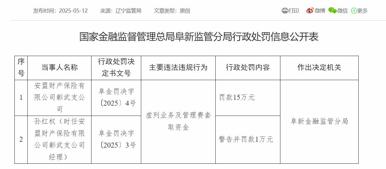 5月12日,国家金融监督管理总局发布处罚信息 ,因虚列业务及管理费套取资金,安盟财产保险有限公司彰武支公司被罚款15万元,孙红权(时任安盟财产保险有限公司彰武支公司经理)被警告并罚款1万元。