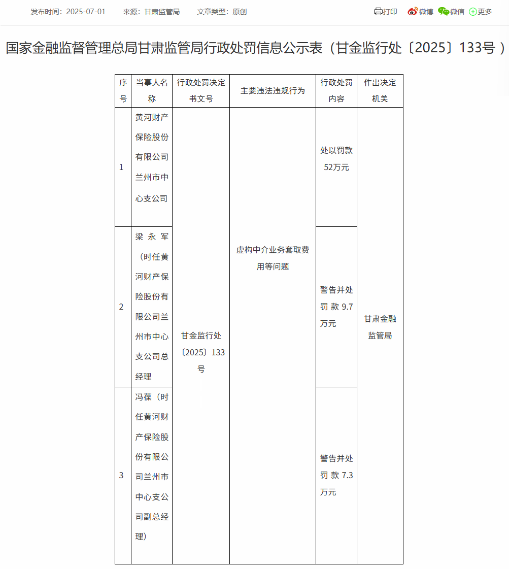 7月1日,国家金融监督管理总局发布处罚信息,因虚构中介业务套取费用等问题,黄河财产保险股份有限公司兰州市中心支公司被处以罚款52万元,梁永军(时任黄河财产保险股份有限公司兰州市中心支公司总经理、冯葆(时任黄河财产保险股份有限公司兰州市中心支公司副总经理)分别警告并处罚款9.7万元、7.3万元。