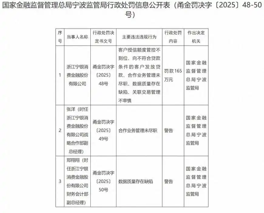 浙江宁银消费金融股份有限公司因客户授信额度管控不到位等5项违规收165万元罚单