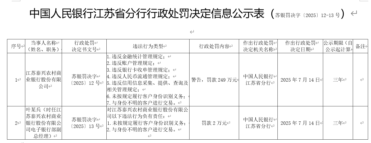江苏泰兴农商银行因与身份不明客户交易等7项违规,收249万罚单