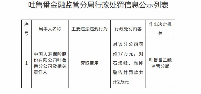 7月23日,国家金融监管总局官网消息显示,中国人寿吐鲁番分公司因套取费用,被罚款17万元。相关责任人石海峰、陶刚均被警告并罚款共计2万元。