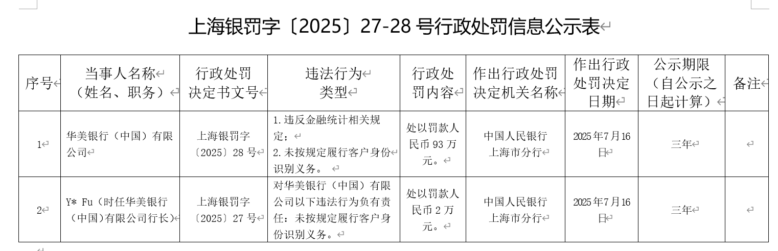 近日,中国人民银行上海市分行发布的行政处罚信息公示表显示,华美银行(中国)有限公司因两项违规行为受到处罚:一是违反金融统计相关规定,二是未按规定履行客户身份识别义务。依据相关规定,该公司被中国人民银行上海市分行处以93万元人民币罚款。华美银行