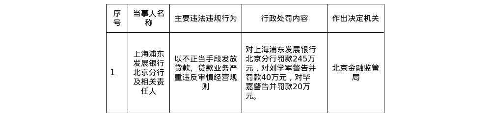 针对上述违法违规行为,北京金融监管局对上海浦东发展银行北京分行罚款245万元;对刘学军警告并处罚款40万元;对毕嘉警告并处罚款20万元。