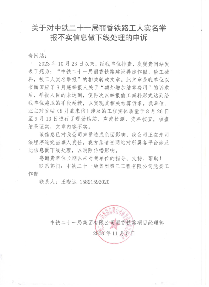 但在11月6日,为民网收到中铁二十一局集团有限公司丽香铁路项目经理部的函告称:上述举报文章内容不实,该信息已对其公司声誉造成负面影响,公司正在走司法程序追究当事人责任。
