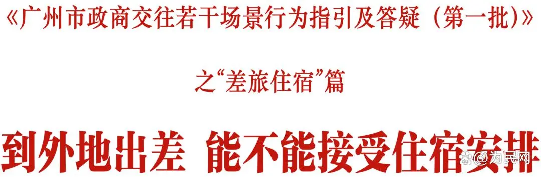 针对公职人员去外地出差都会遇到的“差旅住宿”问题,《广州市政商交往若干场景行为指引及答疑(第一批)》(以下简称《指引》)分门别类给出了详细解答,并清晰直观列出可以开展事项、禁止事项,为公职人员出差住宿指明方向,划出“红线”。