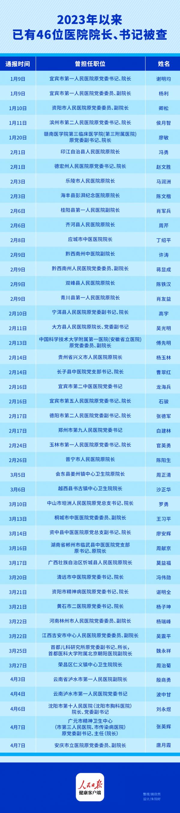 首都儿科研究所原党委副书记、所长魏永祥(副局级)开除党籍、开除公职处分;河南林州市人民医院党委委员、副院长杨瑞峰涉嫌严重违纪违法接受调查;安徽省安庆市立医院原党委委员、副院长唐月霞严重违纪违法被双开……据人民日报健康客户端不完全统计,截至4月7日,2023年已有46位医院党委书记、院长被查,医疗领域的突出问题正成为反腐的重点之一。