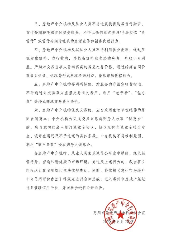 值得注意的是,除了倡议和指导房产中介机构及从业人员规范经营行为,该《提示》还明确了行业的惩戒机制。提出,对于违反行业规范行为企业,该协会将报送行政主管部门依法依规查处。同时依据《惠州市房地产中介信用评价办法》等规定进行自律惩戒,记入惠州市房地产经纪行业管理信用平台,并公开向公众通报。