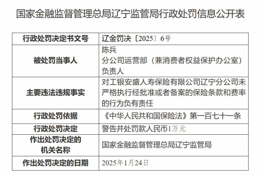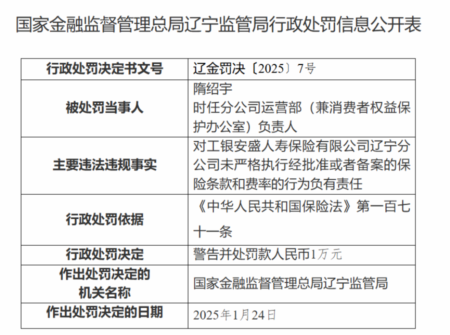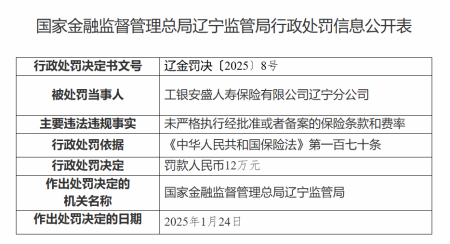 2月24日,国家金融监督管理总局发布处罚信息,因未严格执行经批准或者备案的保险条款和费率工银安盛人寿保险有限公司辽宁分公司被罚款人民币12万元。