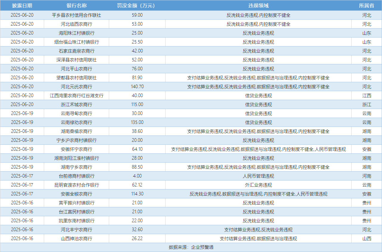 今年以来,对于农村中小金融机构监管力度不断加强。企业预警通数据显示,6月16日至6月20日一周内,监管部门共对农商行、农信社、村镇银行等农村金融机构开出26张罚单,合计被罚没金额1417.54万元。其中,反洗钱业务违规尤为突出,成监管处罚重点领域。