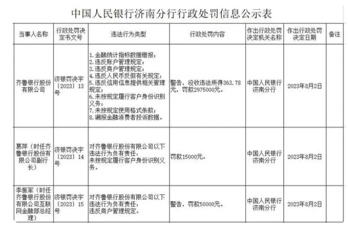 近日,中国人民银行济南分行发布的行政处罚信息显示,齐鲁银行因金融统计指标数据错报等8项事由被警告,没收违法所得363.78元,罚款297.5万元。