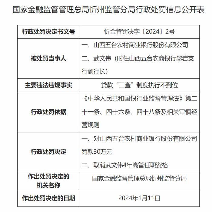 忻金管罚决字〔2024〕2号罚单显示,山西五台农商行因贷款三查制度执行不到位又被罚款30万元,时任山西五台农商行翠岩支行副行长武文伟被取消高管任职资格4年。