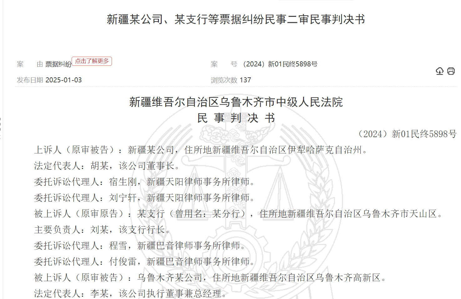 近日,新疆维吾尔自治区乌鲁木齐市中级人民法院对一起票据纠纷与保证合同纠纷交织的案件作出终审判决,驳回新疆某公司的上诉请求,维持原判。