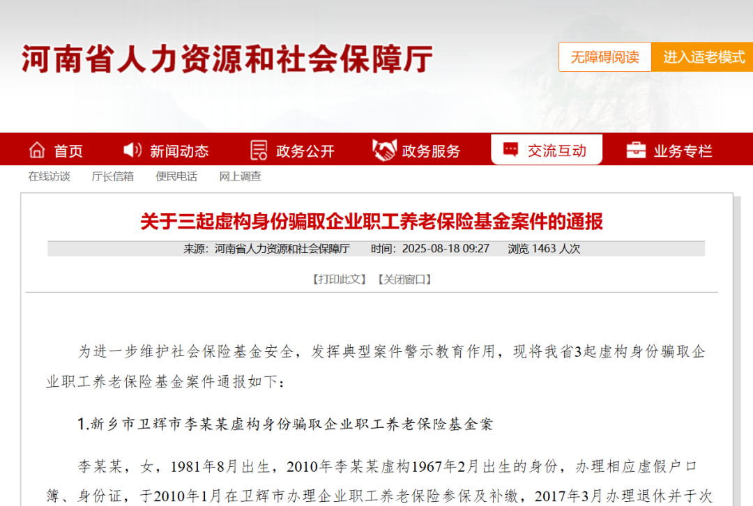 8月21日,河南省人力资源和社会保障厅发布关于三起虚构身份骗取企业职工养老保险基金案件的通报。