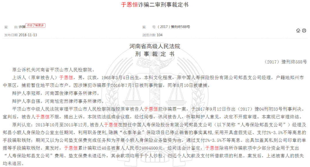 另据裁判文书网,于恩恒在职期间利用职务便利,采用私刻公章、虚开保险凭证等手段,以高息为诱饵,合计诈骗40余名被害人共计2408万余元,并将大部分款项用于个人炒股、归还个人欠款及利息,构成诈骗罪。最终被法院判处无期徒刑,剥夺政治权利终身。